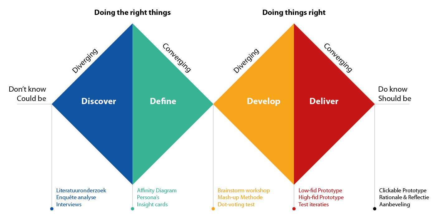 Mijn ontwerpprocess volgens de double-diamond indeling.