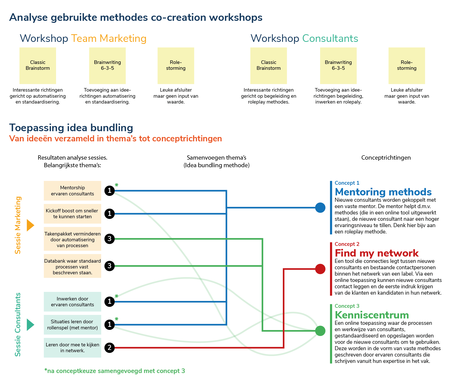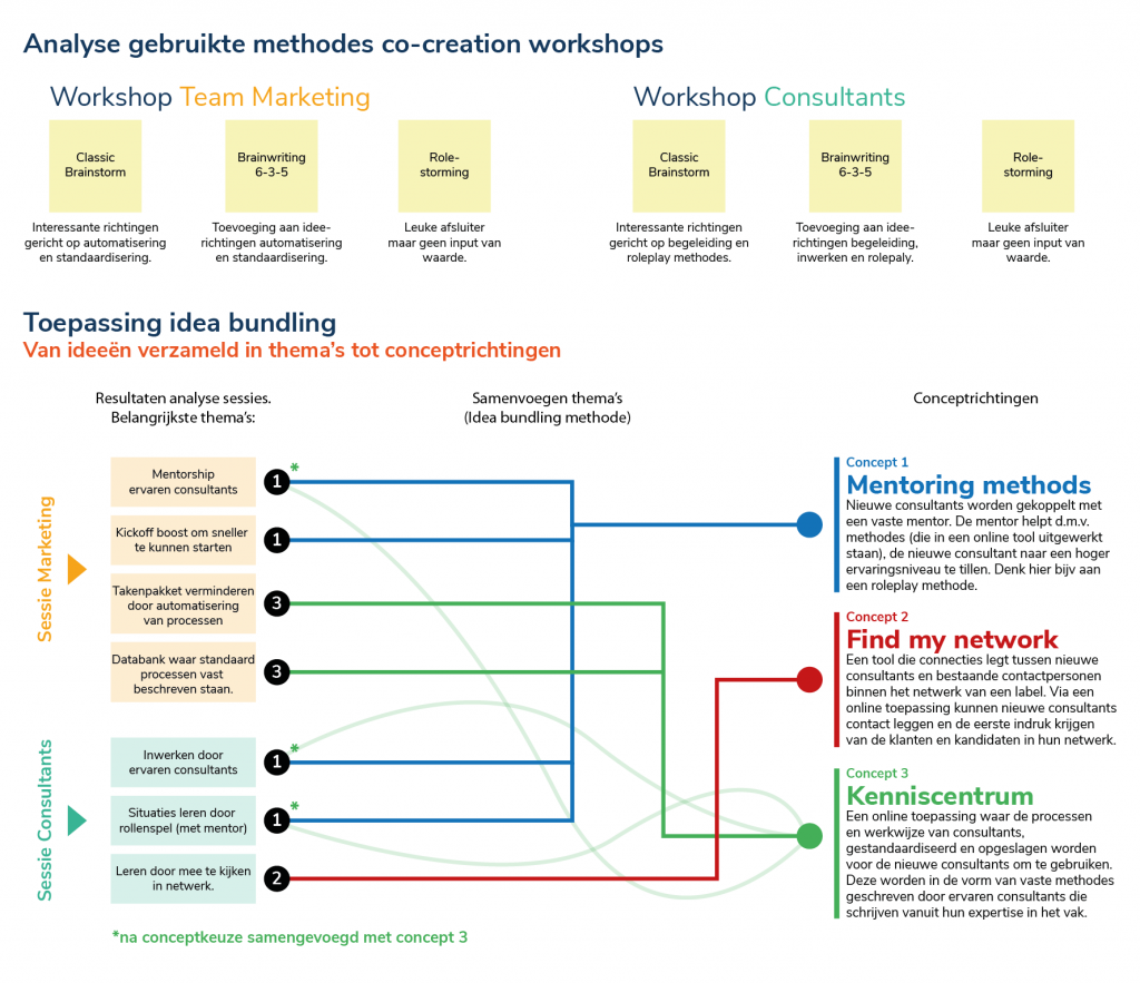 Overzicht van de ideevorming workshops. Inhoudelijk (boven), Resultaat (onder).