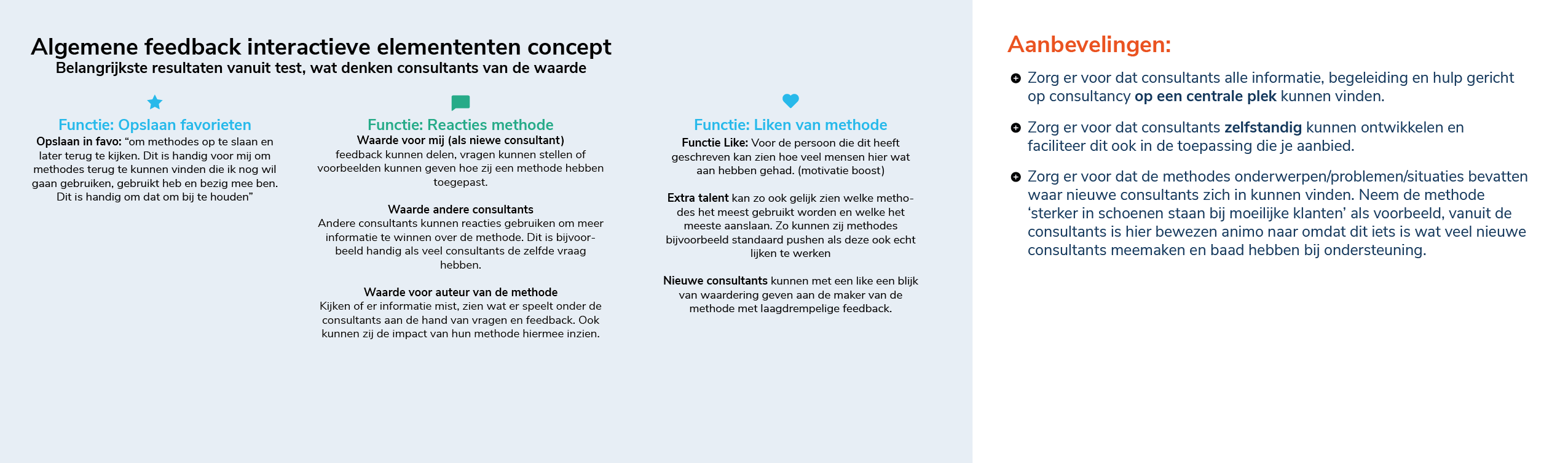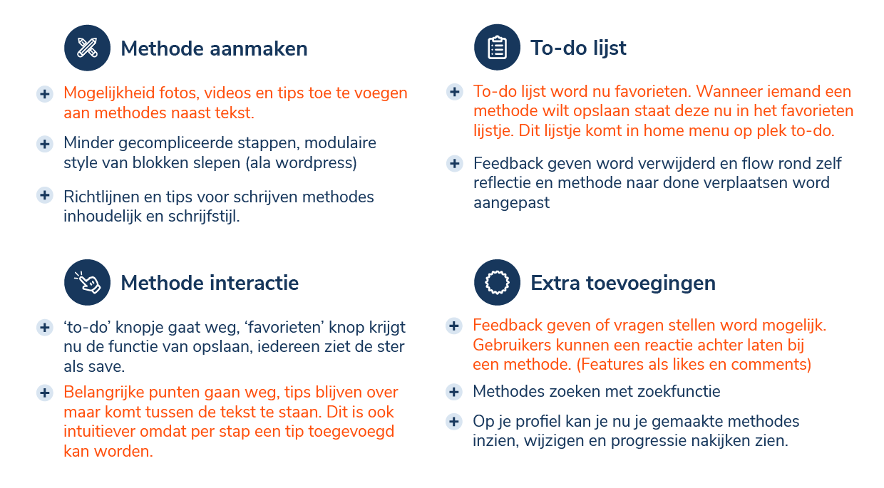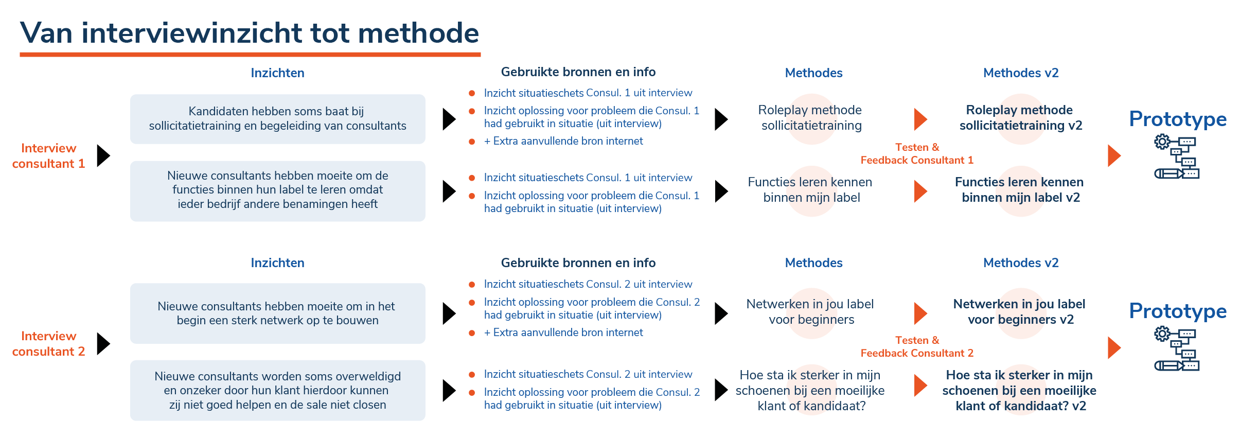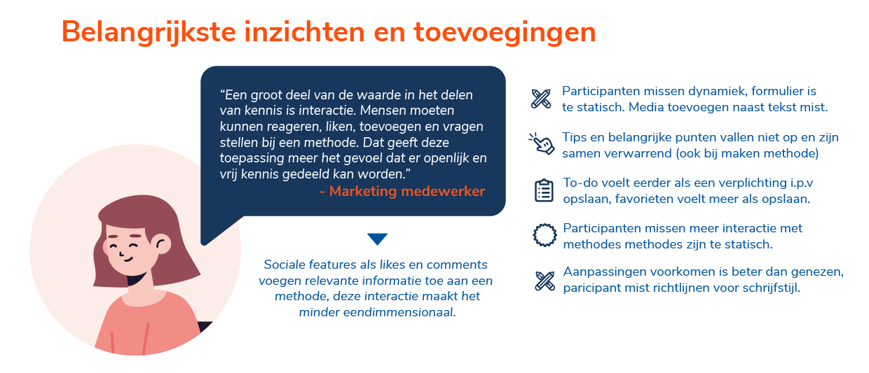 Vanuit inzichten uit de interviews heb ik een aantal opzetjes geschreven voor methodes, om deze te testen ben ik samen met de originele consultants gaan zitten waar deze inzichten vandaan zijn gekomen. Ik heb hun de methodes laten lezen en vrij feedback laten geven hierop. Zo zijn wij samen tot de optimale vorm van de methodes gekomen. Hierbij is een leuke bijvangst dat zij erg enthousiast werden van de methodes en het idee.