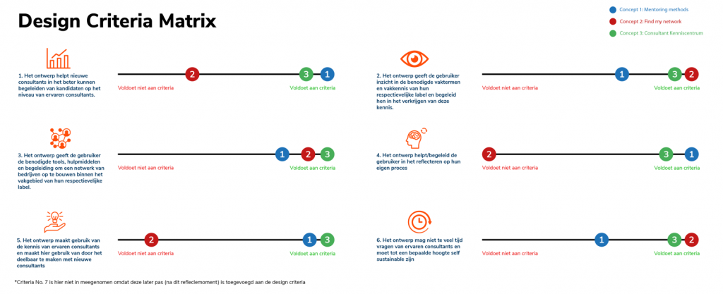 Uit de ideevorming workshops zijn drie sterke concepten gekomen, de design criteria hebben bij deze keuze een belangrijke rol gekregen. Per criteria is er gekeken welk concept hier het beste op aansluit. Ook hier was concept 3 het sterkst. Hoewel concept 1 en 2 uitblinken in een aantal criteria, concept 3 was op alle punten consistent en solide. Concept 3 sluit dus het beste aan op de inzichten vanuit de doelgroep dus dit maakt de keuze uiteindelijk makkelijker voor mij. Vanaf dit punt gaat concept 3 (Het Consultant Kenniscentrum) uitgewerkt worden.