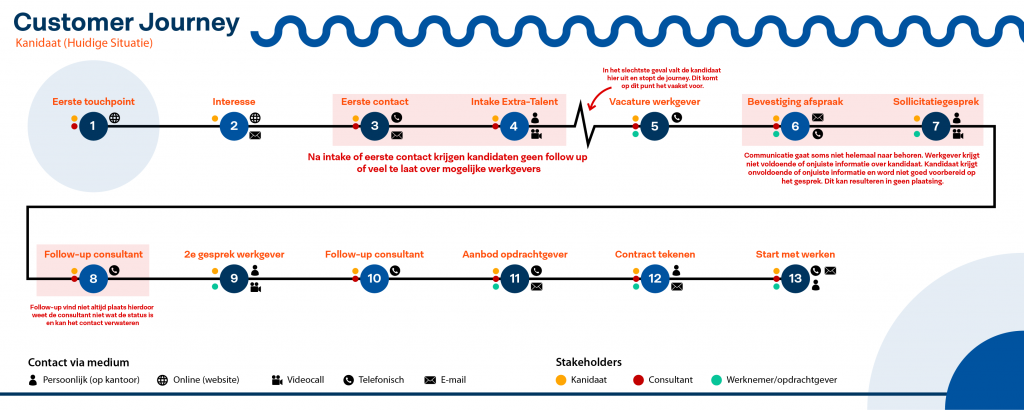 Dit project staat het contactprobleem tussen twee groepen centraal. Omdat dit op zichzelf een vrij abstract idee is, is het belangrijk om een duidelijk beeld de schetsen wat dit contact is, hoe dit contact precies verloopt en welke touchpoints belangrijk zijn. De tool die ik heb ingezet om dit op een visuele manier te communiceren is de Customer Journey. In deze journey beschrijf ik de contactpunten die consultants samen met kandidaten doorlopen. Dit alles is op basis van inzichten uit interviews en enquêtes. Het startpunt is het eerste contact online en dit loopt door tot na de plaatsing van de kandidaat. Per punt wordt beschreven welke methodes van contact worden ingezet en welke stakeholders hierbij betrokken zijn. Belangrijk is ook de rode vlakken die aangeven op welke punten het vaak fout gaat in het onderhouden van dit contact.