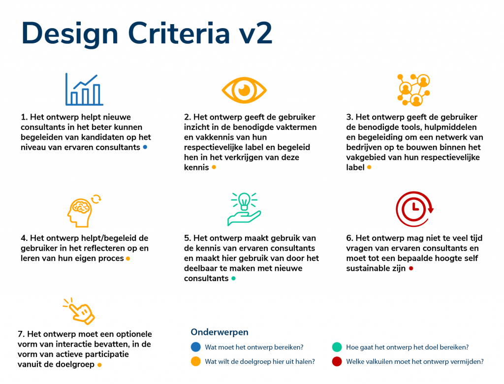 Om tot een goed aansluitend ontwerp voor je doelgroep te komen is het van cruciaal belang dat eerst de richtlijnen en kaders opgesteld worden. Zonder deze regels is de kans groot dat: je jezelf voorbij streeft, de doelgroep vergeet en het einddoel mist. Dit zou zonde zijn aangezien er veel interessante inzichten uit het onderzoek zijn gekomen vanuit deze doelgroep. Deze inzichten staan dan ook aan de basis van de design criteria. In dit project zijn 7 concrete criteria opgesteld die onder te verdelen zijn in 4 verschillende categorieën.