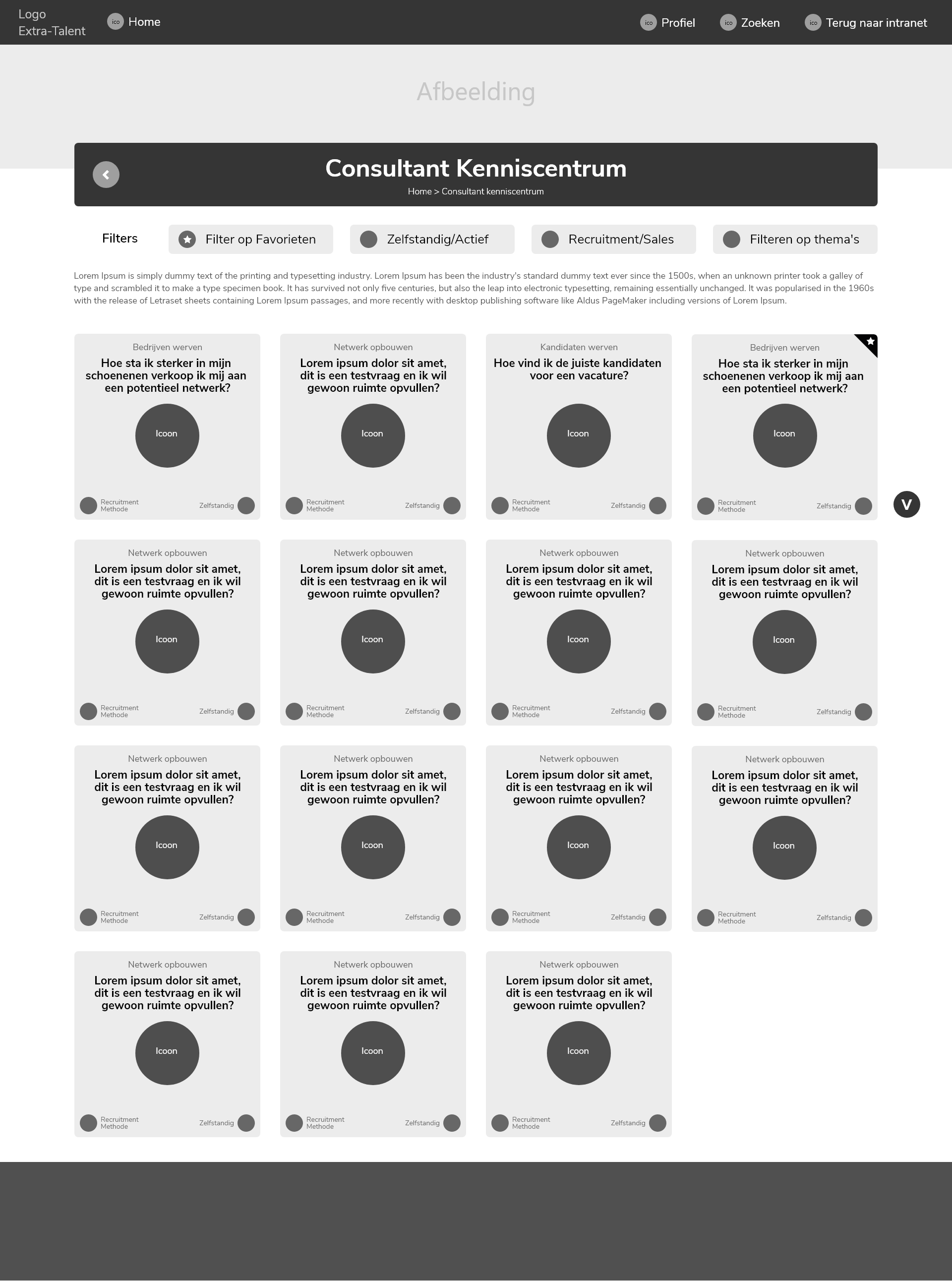 In deze fase zijn er schetsen gemaakt van een aantal van de core functies van het concept en deze zijn als wireframes digitaal uitgewerkt. Samen met een aantal toegevoegde functies uit andere concepten en feedback vormen deze de eerste iteratie. Deze wireframes vormen het basis framework van het Kenniscentrum, dit moet voor de ontwikkeling van het high-fid prototype goed getest en verfijnt worden.