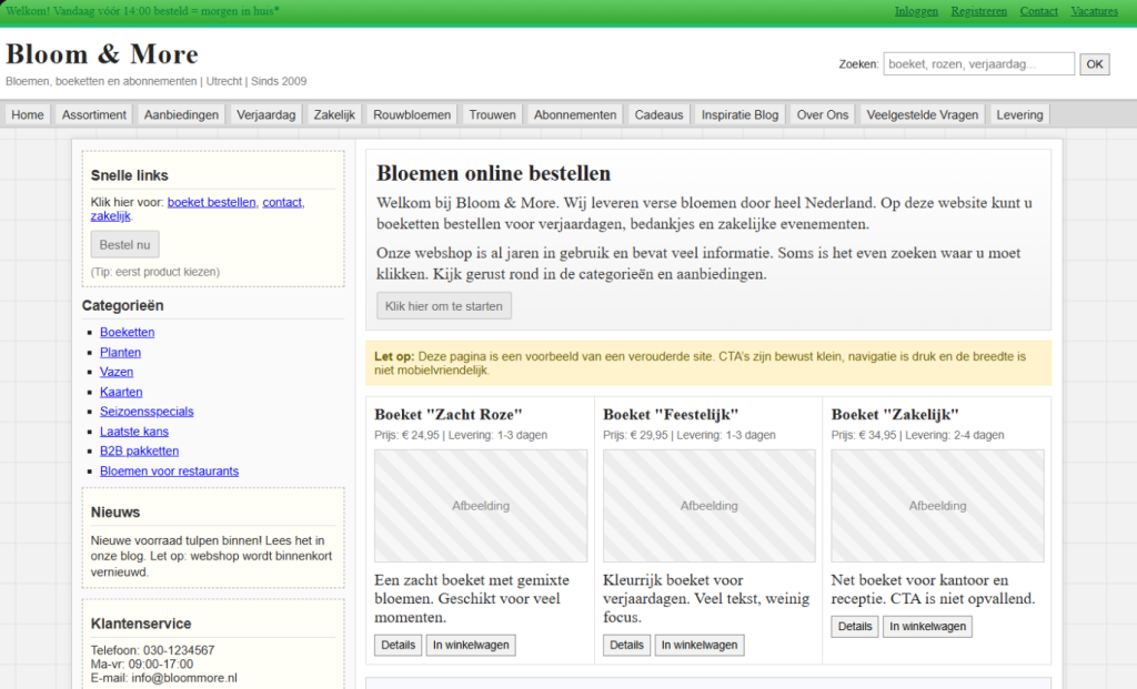 Bloom & More is een middelgrote bloemenwinkel in Utrecht die naast haar fysieke winkel ook online verkoopt. Hoewel het bedrijf groeit in zakelijke leveringen en online ambities heeft, sluit de huidige webshop niet meer aan bij de behoeften van moderne gebruikers. De website is onoverzichtelijk, mobiel onvoldoende geoptimaliseerd, bevat een onduidelijke navigatiestructuur en mist een sterke, zichtbare call-to-action. Daarnaast is het bestelproces omslachtig, wat leidt tot afhakers en gemiste omzet.