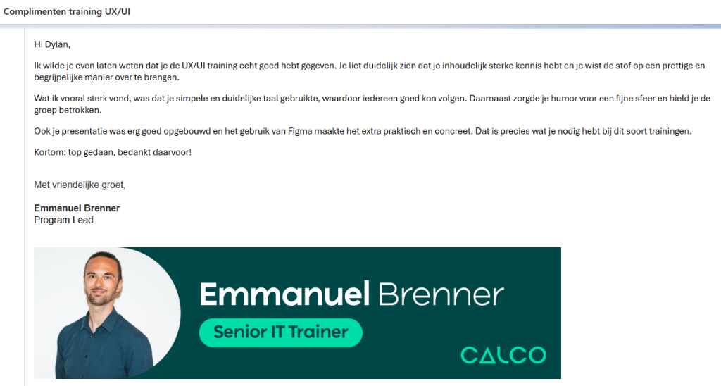 Als afsluiting op de workshop heb ik waardevolle en positieve feedback ontvangen van zowel de senior IT-trainer als de deelnemers. Zij gaven aan dat de combinatie van theorie, praktijkopdrachten en interactieve werkvormen zorgde voor een duidelijke en inspirerende introductie in UX/UI design. Met name het direct toepassen van inzichten in een realistische case werd als leerzaam en verrijkend ervaren. Deze feedback bevestigt voor mij het belang van UX-educatie binnen IT en motiveert mij om dit soort sessies vaker te organiseren en verder te ontwikkelen.